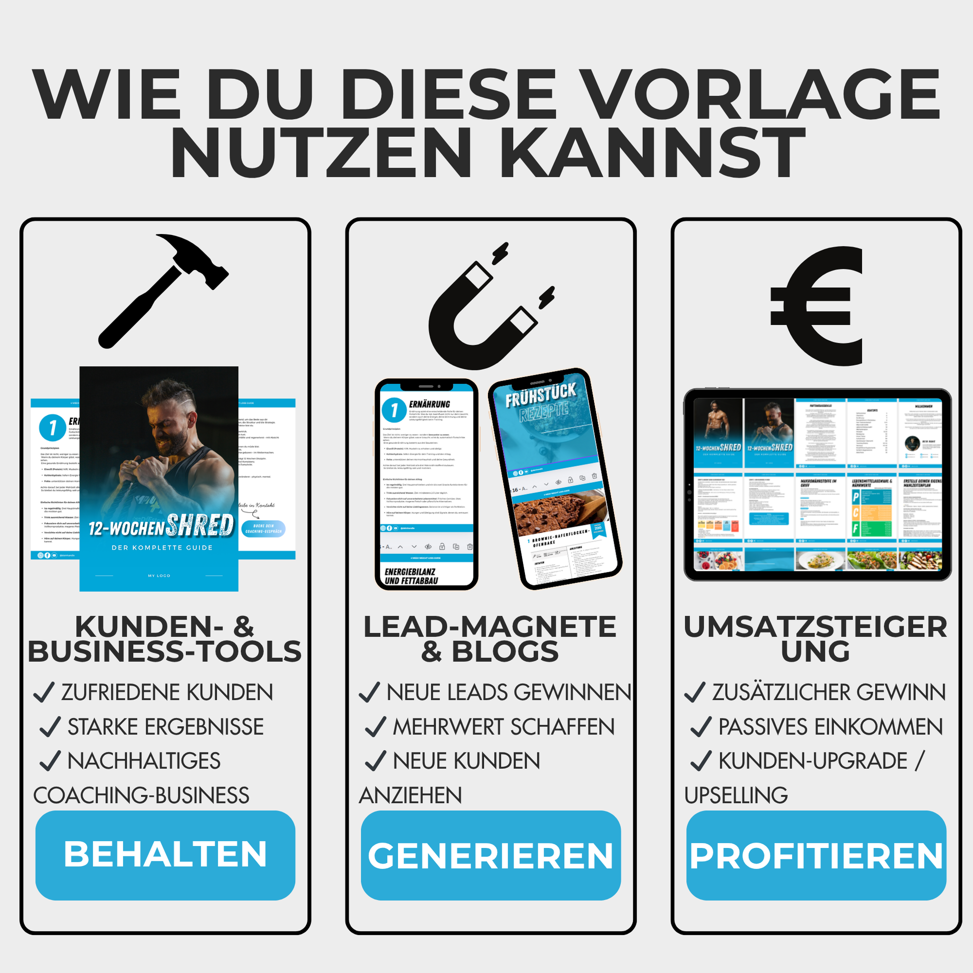 Mit wertvollen Coaching-Inhalten rund um Ernährung, Training, Mindset und Regeneration bietet dir diese Vorlage alles, was du brauchst, um professionelle Ergebnisse zu liefern – ohne stundenlang selbst PDFs zu erstellen.